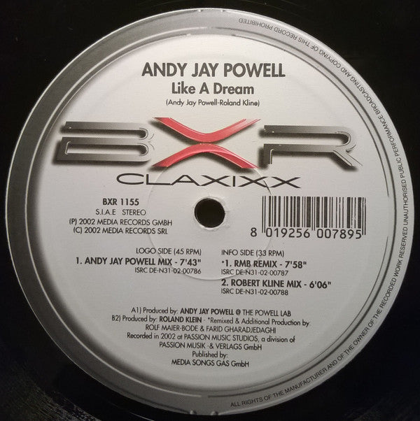 Side A plays at 45 RPM; side B plays at 33⅓ RPM. (P) 2002 Media Records GmbH (C) Media Songs Srl A1: Produced @ The Powell Lab B1: Recorded in 2002 at Passion Music Studios, a division of Passion Musik & Verlags GmbH Published by: Media Songs GAS GmbH BXR is a trademark of Media Records Productions